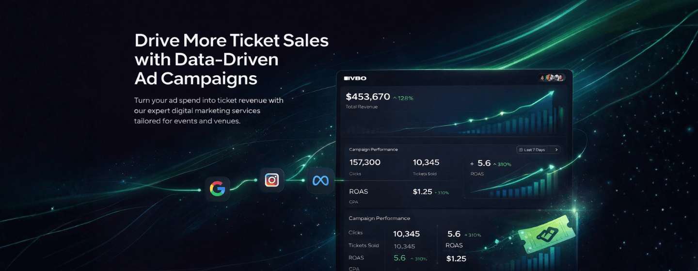 VBO Digital Marketing Services is a fully managed service that runs your Google, Facebook, Instagram, and YouTube campaigns to drive measurable ticket sales. Reach new audiences, retarget past patrons, and turn interest into ticket purchases with campaigns built specifically for event organizations.